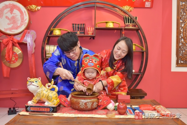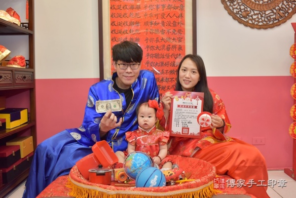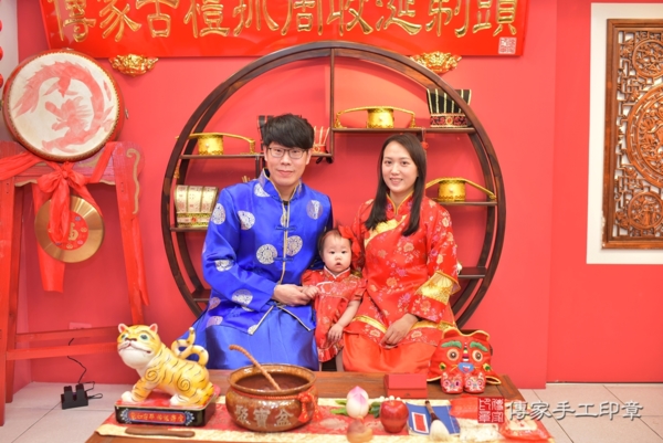 台中謝家來抓周~全家選擇中式古禮服藍色象徵智慧、紅色象徵喜氣,爸爸身上的圓形圖紋簡約又吉祥,媽媽身穿百花圖紋,氣質又優雅,謝寶寶身穿牡丹花禮服,象徵高雅富貴,接下來是活動合照一起來看看吧~~