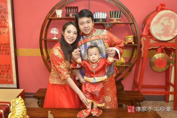 新北龔家來抓周~全家選擇中式古禮服,龔家一家挑選了中式風格古裝禮服,紅色象徵喜氣,爸爸身上的日系風菊花圖紋象徵高貴儒雅;媽媽身上的孔雀及花朵象徵美好、幸福;龔寶寶衣服上的福字代表福氣!接下來是活動合照一起來看看吧~~