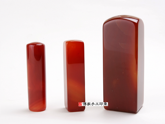 1.        紅瑪瑙公司大小印章實際成品。紅瑪瑙的公司印章,會用柱狀的造型,這樣印材可以充分被運用。這組紅瑪腦公司印章的尺寸:長2.9公分,寬2.9公分,高8公分。紅瑪瑙個人印章,雙章,一圓一方。圓章象徵「財源滾滾」,適合當做銀行開戶使用。方章象徵「方方正正」,可以在簽約、購買房子時,可以使用。六分個人開運印章尺寸:長1.8公分,寬1.8公分,高6公分。每一個紅瑪瑙印章,都有屬於自己的天然紋路。注意:因為紅瑪瑙是天然的礦石,所以印章的尺寸會隨著原礦而調整,大小不一致。