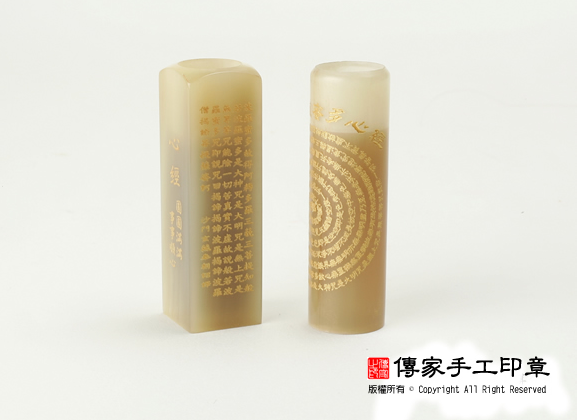 1.        赤牛角加心經開運印章,雙章,一圓一方。圓章象徵「財源滾滾」,適合當做銀行開戶使用。方章象徵「方方正正」,可以在簽約、購買房子時,可以使用。六分個人開運印章尺寸:長1.8公分,寬1.8公分,高6公分。