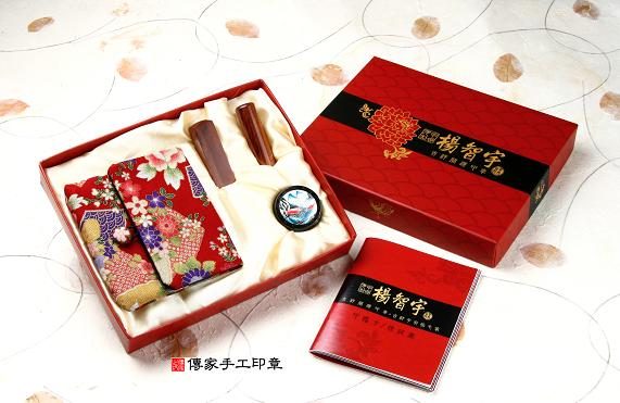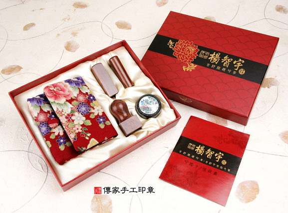 2. 傳家手工印章━「紅紫檀木開運印章的實際成品」。包含:紅紫檀木印章、全手工印章外出袋、印泥、傳家手工印章的保證書、精美中國風的印章外盒(印盒有四大風水神獸:左青龍、右白虎、前朱雀、後玄武)。