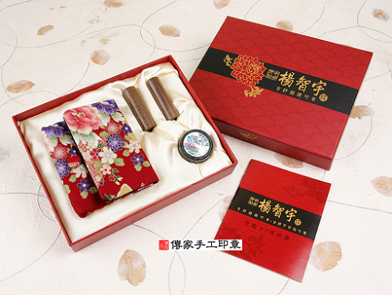 2.        傳家手工印章━「玫瑰檀木開運印章的實際成品」。包含:玫瑰檀木印章、全手工印章外出袋、印泥、傳家手工印章的保證書、精美中國風的印章外盒(印盒有四大風水神獸:左青龍、右白虎、前朱雀、後玄武)。
