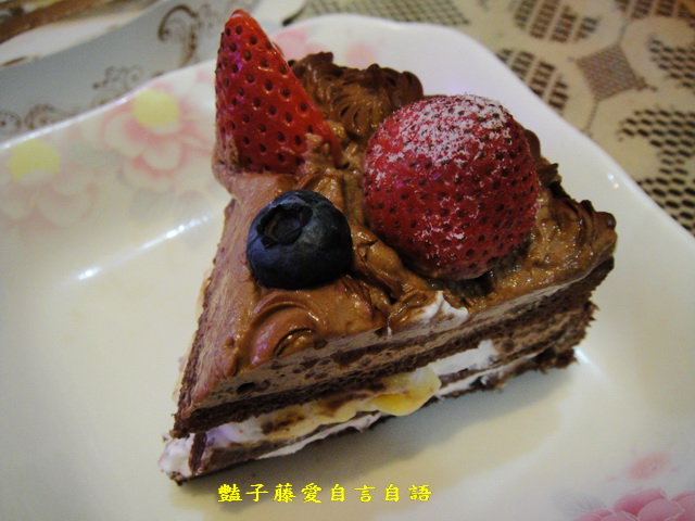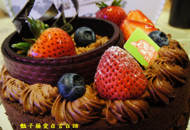 尊爵巧克力蛋糕華麗的蛋糕裝飾,完全滿足了視覺的感受。紅色的、亮麗的、鮮豔欲滴的大顆草莓擺在巧克力慕斯旁,格外吸睛。