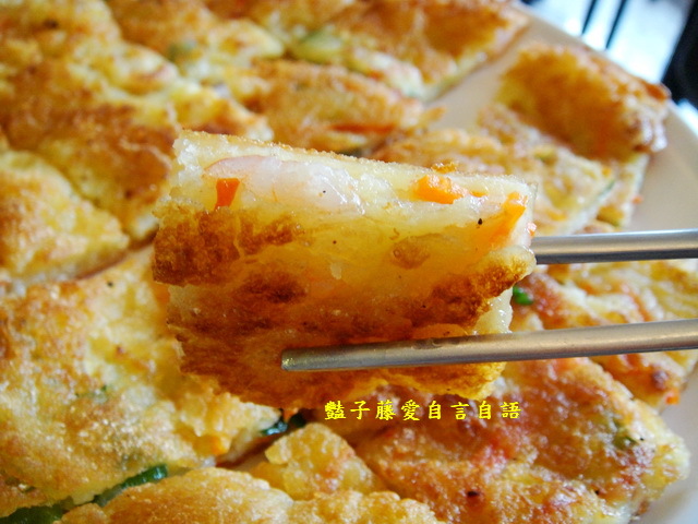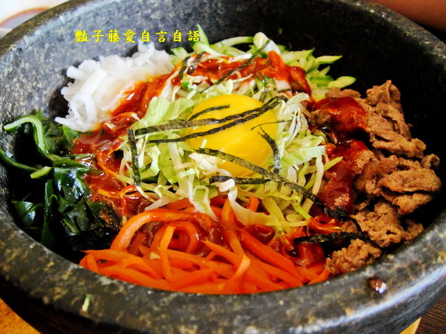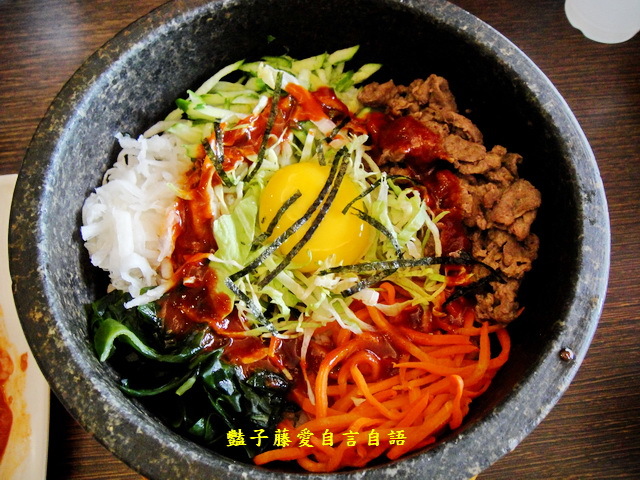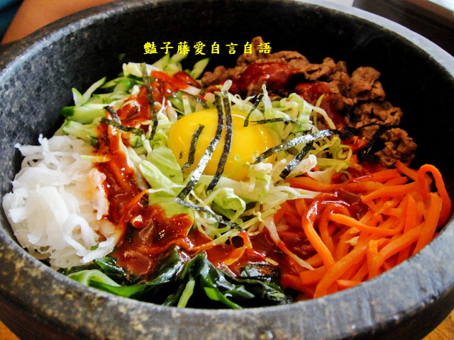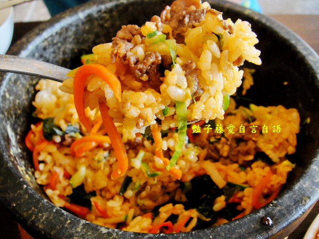【豔子藤就是愛美食】台中韓式料理食記&金韓道韓式料理.香噴噴的海鮮煎餅香酥可口,外酥內軟伴隨著海鮮味的韓式煎餅,再沾上特調醬汁非常好吃.牛肉石鍋拌飯淋上韓式辣醬調味,再搭配著黃澄澄的蛋黃和泡菜,拌飯後等待中的美味鍋巴就悄然現身囉!還不過癮!再點上一道銅盤烤肉,滋滋作響的烤肉美味讓人食指大動啊!