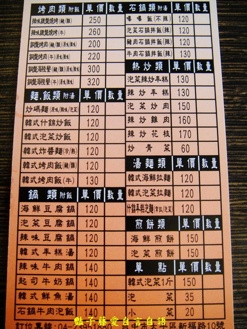 金韓道韓式料理 菜單 點餐後會送上五道小菜,每種小菜可免費續一次. 金韓道韓式料理另外有零售的韓式泡菜. 銅盤烤肉 $200 銅盤烤肉可以選擇喜歡的肉類(豬肉、雞肉、牛肉)一盤和辣度(原味、辣味), 開始享用韓式烤肉囉! 加入菜盤裡的蔬菜和豆腐,在銅盤上鋪上美味的烤肉,拿起扁筷準備開動!
