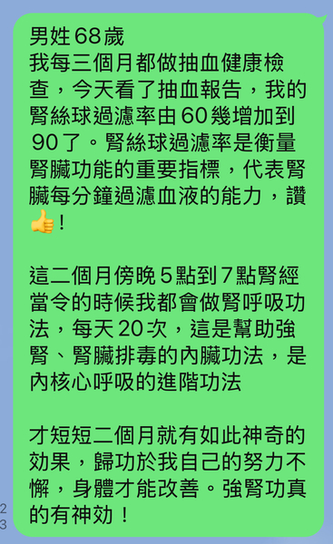 才短短二個月就有如此神奇的効果, 歸功於我自己的努力不懈, 身體才能改善。 強腎功真的有神効!