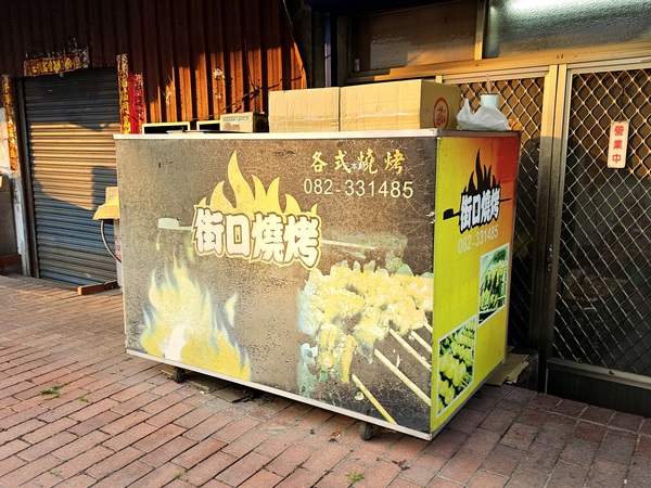 街口燒烤位於金門東半島金湖地區的大馬路旁,正確的說是在金門著名的寺廟~護國寺附近、國順街的街口,當然會發現這一間燒烤店要感謝二貨好友帶路,第一次上門是二貨來電相約一同到金湖國賓影城看電影,當時我們從金城開車前來國賓影城路過國順街時二貨問我:想吃燒烤不?我:好!於是第一回上門光顧街口燒烤,趁等燒烤之際二貨告訴我:這一攤燒烤店在他唸書的時候他早就吃過了,只是那已是20多年前的往事... 二貨說:20多年前那時候金門島上有好幾萬的駐軍,每當假日時他要到僑聲大戲院看電影時都會買上一些燒烤或鹹酥雞帶到戲院裡去吃,那時位於僑聲大戲院的出口對面(原址現已是金門縣榮民服務處)有2家攤販式的炸雞店,那個年代像這種攤販並不會掛上店號,有一間生意超好的叫〝阿福炸雞〞,另一家是從山外來這一擺攤的老闆好像是個外省人,再來就是位於山外車站對面新市里籃球場木棉道巷口旁的燒烤店(街口燒烤的前身),那時候街口燒烤是由老老闆與老老闆娘掌管攤位,每當假日時常常都嘛要跟阿兵哥一起排隊搶食物,歲月不饒人這一晃就是20年...