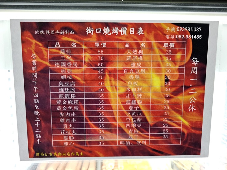 街口燒烤的價目表