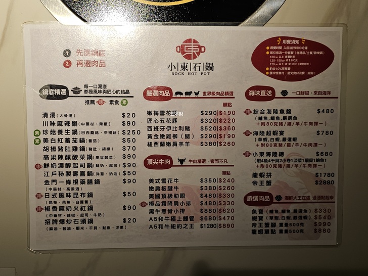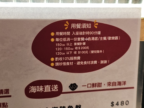 用餐須知: 1.用餐時間為90分鐘 2.每人最低消費一份套餐(含湯底、主餐、歡樂霸) 兒童計費方式: 1.身高超過150CM以套餐計費 2.身高120CM~150CM 收150元 3.身高120CM以下 收50元(嬰兒除外) 4.不論兒童或成人用餐都需加收10%服務費/嬰兒除外
