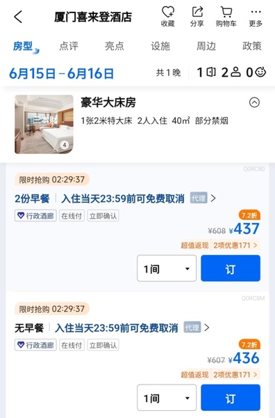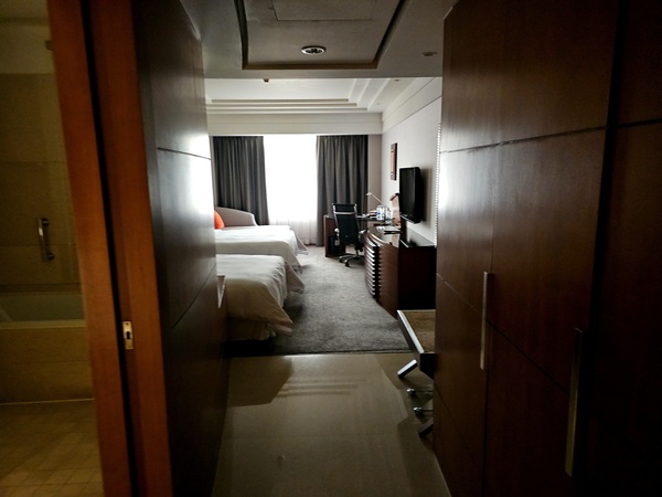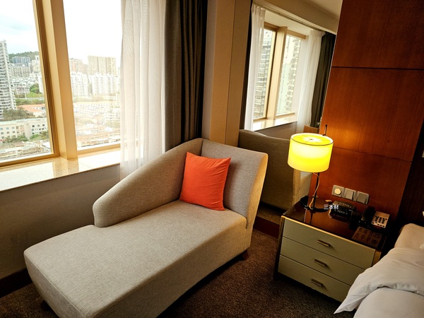 第一次入住廈門喜來登酒店我們預訂行政客房,當天辦理住宿時櫃台人員告知隔天可以延遲到下午16點退房,拿了房卡搭乘電梯進入房間後發現是屬於陽春型的行政客房,至於迎賓水果印象中給過一次,當天房務送來時我一直狂笑:因為只有一顆蘋果+牛軋糖+餅乾,我本身也不太喜歡吃水果倒也無所謂!比較讓我感到意外的是冰箱裡空蕩蕩的並沒有Mini Bar,也沒有膠囊咖啡... 上一回端午連假我入住廈門喜來登酒店豪華大床房曾經訂到一晚只要479塊,前幾天我竟然看到一晚只要437塊人民幣/折合台幣大約1831.47元的超低價!房費包含〝2客自助早餐+行政酒廊(下午茶+歡樂時光)〞當下我就直接下單,今天約了幾位好友打算去廈門按摩順便住上一晚,明天吃完早餐中午再搭船回來上班,如果臨時不去還能免費取消反正我也沒有損失...