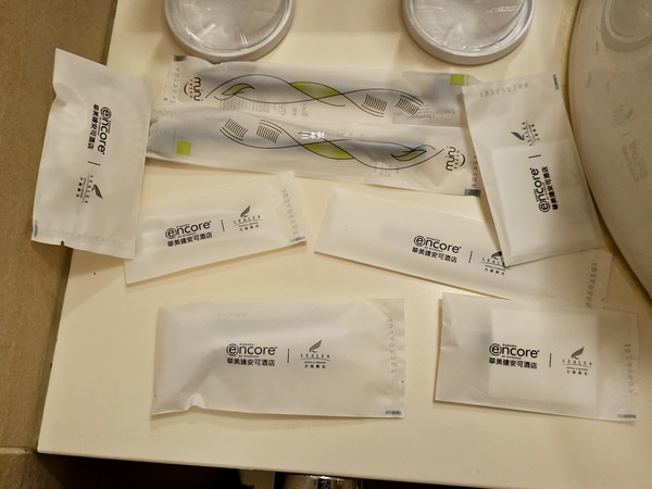 浴帽、牙刷、梳子、化妝棉、刮鬍刀、牙線棒、衛生袋