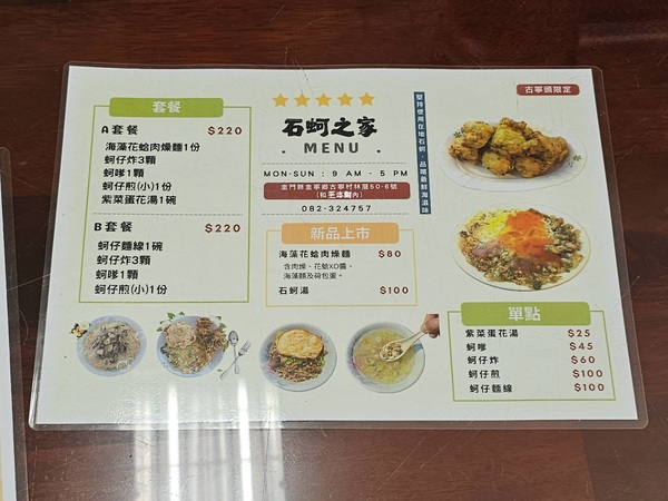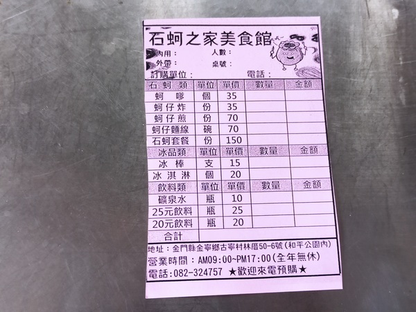 石蚵之家美食館 營業時間: 09:00-17:00 訂位電話:082-324757 地址:金門縣金寧鄉古寧村林厝50-6號