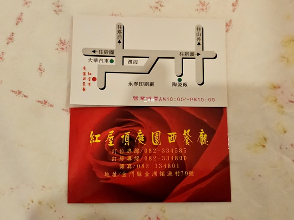 紅屋頂庭園西餐廳 營業時間: 午餐11:00-14:00 晚餐17:30-22:00 電話:082-334585 地址:金門縣金湖鎮新湖里漁村79號 官網/FB: