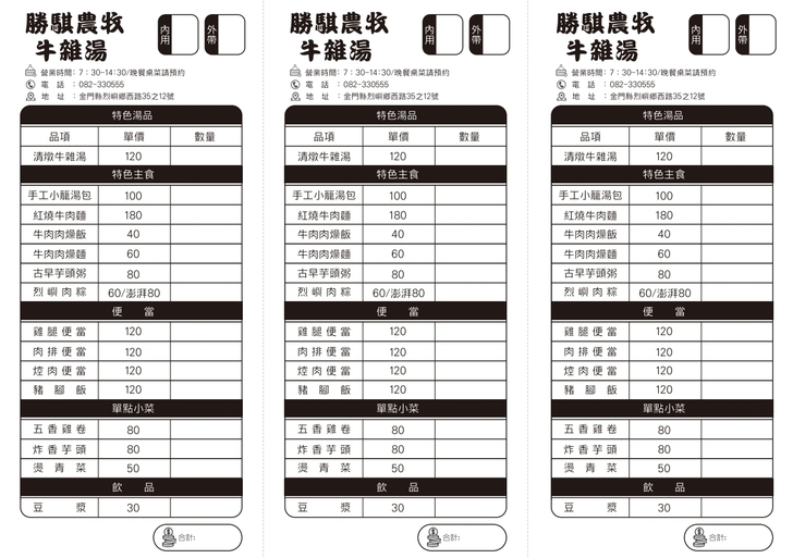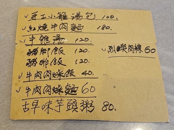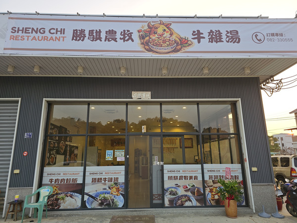 今天中午在公司吃完便當後就直接開車到小金門去摸魚,一整個下午都在小金洽公,傍晚下班後我開車來到八達樓子旁的全家購買咖啡,只是當我停好車後意外看到一旁勝騏農牧的布條,當時老闆正在外面我隨口問了老闆有營業嗎?老闆說有的,看了一下臨時手寫的菜單有:手工小籠湯包、紅燒牛肉麵、牛雜湯、豬腳飯、豬排飯、牛肉肉燥飯、牛肉肉燥麵、烈嶼肉粽、古早味芋頭粥...