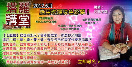 ◎【課程大綱】:(1). 78張塔羅牌裡色彩的分佈解密。 (2). 塔羅牌中所表現出的色彩代表的意含。 (3). 如何將色彩應用在個人身上。 ◎【活動日期】:2012/6/10(日)下午2:00~4:00 ◎【活動地點】:塔羅事典-孟小靖的塔羅博物館 www.looktarot.com 台北市忠孝東路四段162號7樓之1 報名專線:(02)2773-2882 ◎【活動方式】: 1門課/單講(2小時) 400元,(凡在塔羅事典購買塔羅牌,即可享有50元的教學折扣金喔!) ※所有講座請見2012塔羅講堂課程表
