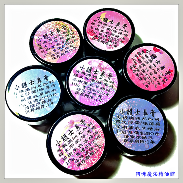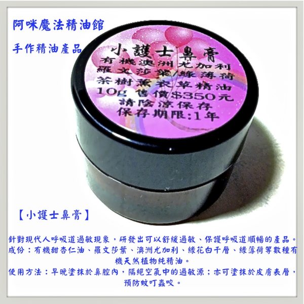 這些年常常有很多朋友問阿咪:「精油真的那麼天然又好用,那到底要怎麼用啊?可是一定要買那麼多瓶回來嗎?一瓶都好貴歐~買不下手 於是去年開始,阿咪特別針對現代人的需求慢慢地在研發出一些真的好用又純天然,且一定與有機認證的精油大廠合作,使用醫療級的純精油;用最低的價格獲取最高的價值,努力推廣芳香療法的好處。於是生出了目前的幾樣產品,但因還在推廣中,所以所有的產品都是由阿咪本身親自去上過由「英國滴莎蘭德精油公司」芳療課程之後,並取得該公司證照後,特別研發製成的哦。 【小護士鼻膏】: 針對現代人呼吸道易過敏現象,研發出可以舒緩過敏、保護呼吸道順暢的產品。 成份:有機甜杏仁油、杜松、檸檬尤加利、綠花白千層等數種有機天然植物純精油。 用法:早晚塗抺於鼻腔內,阻隔空氣中的污染。亦可塗抹於皮膚表層,預防蚊叮蟲咬。也可塗抺於喉嚨及胸口上,舒緩因感冒引起的咳嗽。 售價NT$350元/10g p.s非常適合老煙槍們保養鼻腔及胸腔! 全程皆使用“英國滴莎蘭德精油”產品哦!有需要的朋友們可以來電尋問哦~此次製作濃度為10﹪,非常適合有呼吸道過敏或抽煙的朋友們哦!