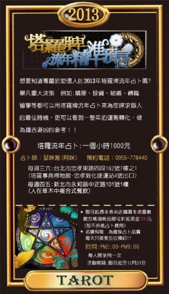 2013塔羅流年精準占卜 馬雅人預言2012世界末日!這是一種象徵說法。但,若是2012/12/21之後,我們都還好好的在這世上;那麼,你有沒有想過在2012年有什麼事未完成?揮別了動盪不安的一年,又要該如何好好規劃自己的2013年? 每年都在12月份時,阿咪開放所有朋友占卜專屬的塔羅流年,舉凡重大決策:事業、轉職、人際關係、戀愛桃花、財富運勢、健康等問題,都可以在塔羅流年裡得到詳細解說,讓你了解運勢、順勢而為!開創2013新格局~ 每日名額限五位,請大家提早預約!