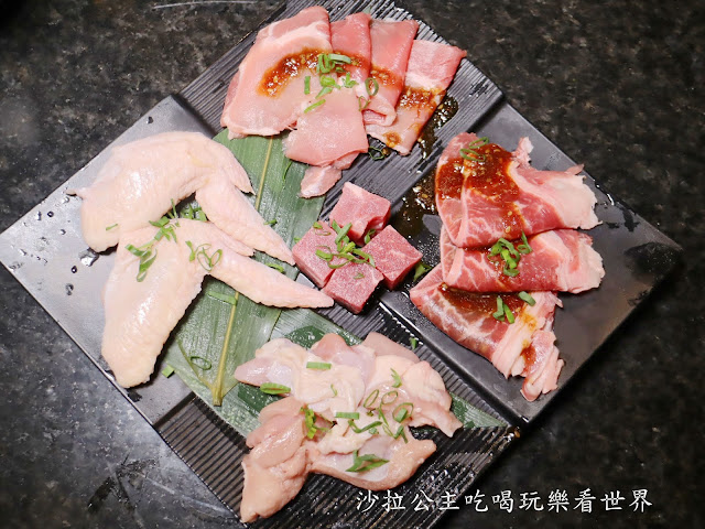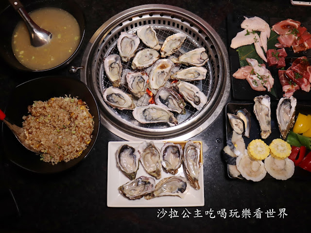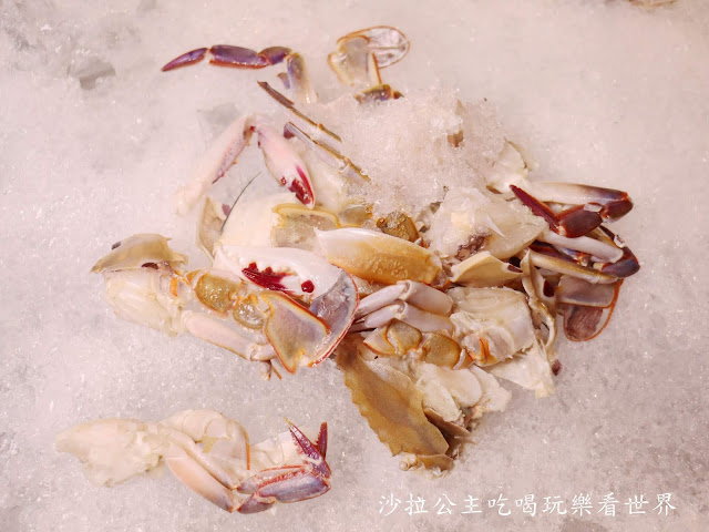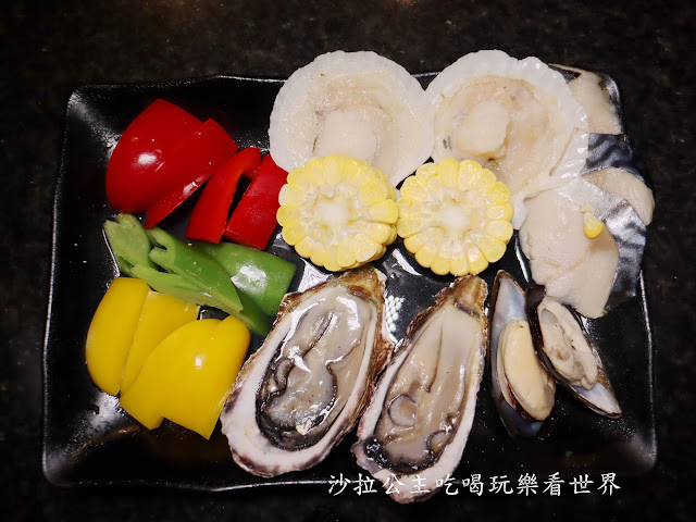 沾醬區,我們只有一開始用了一下芥末,後來就沒用沾醬了 自助取餐區有一半都放生蠔,生蠔不是台灣那種小顆的,是吃buffet那種大顆的,看起來好過癮喔 螃蟹 扇貝、淡菜 魚下巴 快吃飽的時候我才想到今天沒有蛤蜊,可能是因為過年的關係吧 可以烤一些蔬菜營養均衡 自助取餐除+泰國蝦吃到飽外,下面這幾份都是依人數提供一份 雞肉、雞翅、骰子牛、肉片