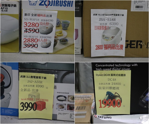 這次的家電區小型家電展示比較多,成推的商品整個家需要用的家電都可以在這裡買到了 剛搬家或想換家電的都可以在這裡選購 象印牌、虎牌的電子鍋這裡也有賣 家裡的電子鍋和熱水器就是用他們家品牌的,他們的品質真的很好,非常耐用,所以就算價格比一般廠牌貴大家都會買單 沙拉拍了幾張象印及虎牌的價差給大家參考