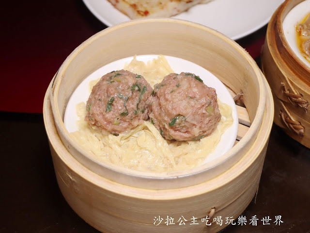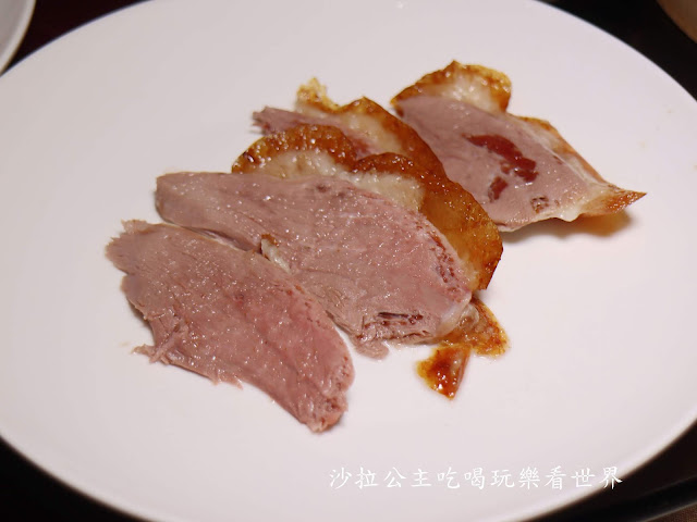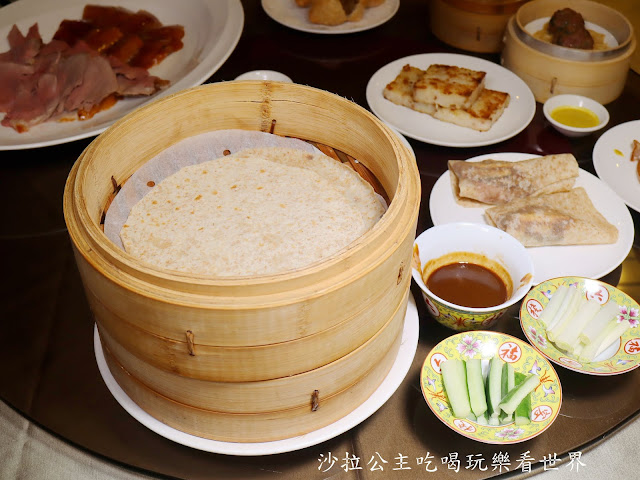 從去年六福皇宮歇業後,大家念念不忘的經典烤鴨,在『六福客棧(金鳳廳)』重現了,曾獲得全台烤鴨必吃的頤園北京料理"御膳黃袍北京鴨"在六福客棧的"頤園正統北京烤鴨三"完美復刻了烤鴨的精髓,還曾吸引日本主廚"速水茂虎道"來台學藝,曾創下當月銷售600隻的紀錄,聽起來就很厲害。除了吃烤鴨外,傳統的推車港點,也可以在六福客棧享用到,天氣漸涼再來個火鍋暖暖身,多樣化的選擇及風味,都可以在『六福客棧(金鳳廳)』得到滿足,現在就跟著沙拉的腳步一起前往『六福客棧』 『六福客棧』位在捷運松江南京站步行3分鐘可到達,交通便利,金鳳廳位在六福客棧的11樓 2019年六福國際線上旅展烤鴨、港點、一品豪邁鍋等限時優惠58折起,僅至11/15止,想搶優惠動作要快喔! 『六福客棧(金鳳廳)』的環境有著中國古典設計,今天剛好有日本來的團體客人來用餐,沙拉就迅速的拍了一下環境 環境適合辦婚禮、尾牙、春酒,除了圓桌也有四人座位區,小家庭及三五好友聚會也很合適 有包廂服務,請提早訂位 吃港式飲茶還能看到傳統的推車港點文化真的很少見了,『六福客棧(金鳳廳)』保留傳統推車港點,感覺更有吃港點的氛圍 可以在蒸籠裡挑選自己喜歡的港點,熱騰騰泡著白煙,看起來特別好吃 蒸好的港點上桌就能吃,聞到香氣,飢腸轆轆的我們拍了一張就忍不住偷吃 蠔汁蒸大腸 喜歡吃大腸的沙拉,不管在那裡看到都要吃一點,大腸一般是比較有嚼勁的,蠔汁蒸大腸吸飽了湯汁,是牙口不好的長者想吃都可以,正好可以滿足一下想吃大腸又怕嚼不爛的朋友 腐皮牛肉丸 這道蠻特別的,牛肉彈牙裡面還帶有鬆軟口感的配料,裹上腐皮一起吃,層次豐富 金鳳鹹水餃 對鹹水餃外皮情有獨鍾,外皮炸的脆中帶Q,有點像麻糬,裡面飽滿的餡料,鹹香滋味令人著迷 香煎蘿蔔糕 港式蘿蔔糕的靈魂就是蘿蔔糕裡加的配料,有別於傳統的蘿蔔糕,不用沾醬都好吃 期間限定的港點 帝王蟹腸粉 腸粉是粵式料理中的經典,腸粉皮是師傅自製米漿製成,嚴格要求2.5mm的最佳厚度,才能兼具Q彈及清透性,腸粉皮的晶瑩度特別美 選用3kg的帝王蟹腳入菜,搭配以蟹殼熬的高湯製成蛋白凍,用料扎實,能吃到帝王蟹的鮮甜味 帝王蟹水晶餃 超可愛的港點,不只是要好吃,還有好看 水晶餃皮使用紅蘿蔔汁調製果凍紅的色彩,沒有使用人工色素,每一隻螃蟹狀的水晶餃都是師傅精細的手工製成 餡料放入帝王蟹蟹肉、蝦泥、豆腐,呈現鼓鼓的螃蟹肚,連蟹螯都有捏出來,Q版螃蟹的可愛狀,真讓人捨不得吃 頤園正統北京烤鴨三吃 來『六福客棧(金鳳廳)』想吃到烤鴨三吃,建議提前三天預定,烹調方式傳承正統北京御膳宮廷做法,嚴選3.5公斤的花東櫻桃鴨,從清洗、打氣、燙水、淋醋水,吹風至明爐式烤鴨絲毫不馬虎 頤園正統北京烤鴨三吃片鴨時師傅會到桌邊服務,聽到鴨皮刨下來的涮涮聲,就很期待入口時的美味 鴨肉片下時鴨油不斷的滴下,好肥美啊~~ 第一吃片皮鴨 片皮鴨可以直接吃或搭配餅皮 片皮鴨卷使用的是全麥餅皮,吃起來較有韌性及口感,搭配甜麵醬、蔥段、小黃瓜,大口咬下非常過癮 除了烤鴨外,特製的甜麵醬也是很厲害的,使用數十種中藥材熬煮,加入蘋果泥增加甜味,佐以鴨肉鴨皮一起吃一點都不油膩