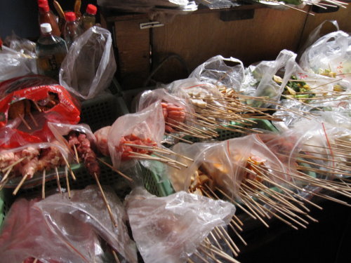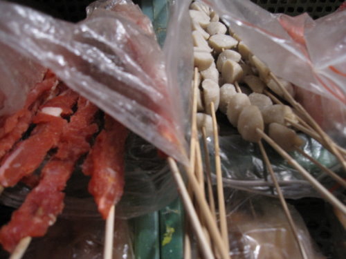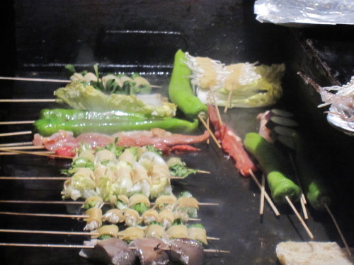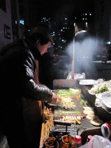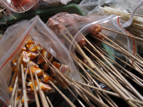 那天吃完假貨江浙菜之後真的非常的不過癮,沒吃到肉所以回到希爾頓飯店導遊確認房間沒有問題後,我們就跟另一位同好同事找吃的去,因為我們要找肉吃 尋著味道,居然讓我們找到路邊燒烤,還走了一小段路,味道真的會轉彎喔! 可見我們想吃肉的心意有多強烈 看老闆擺的這攤是這幾個攤販裡面最大攤總類也最齊全的,早上導遊說不要買路邊攤的話早就拋諸腦後先吃了再說
