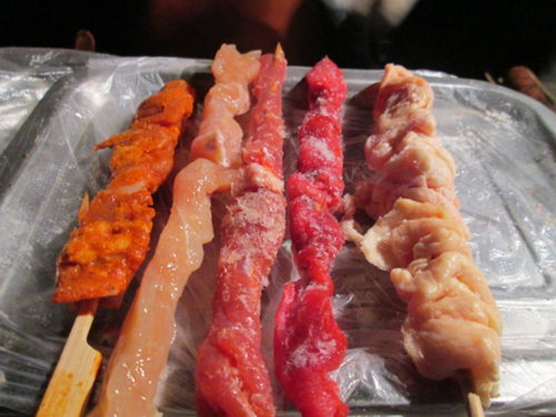 看到肉串雖然很愛吃,又小聲的跟同事說,這肉不知道放在外面會不會壞掉,結果我們把塑膠袋打開一點看,哇~還結霜耶! 這才想到,北京的夜晚都是零下,比冰箱還冰,結冰很正常吧! 同事就放心了拿了一些肉串,肉串一串2元人民弊幣