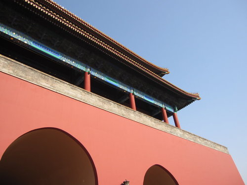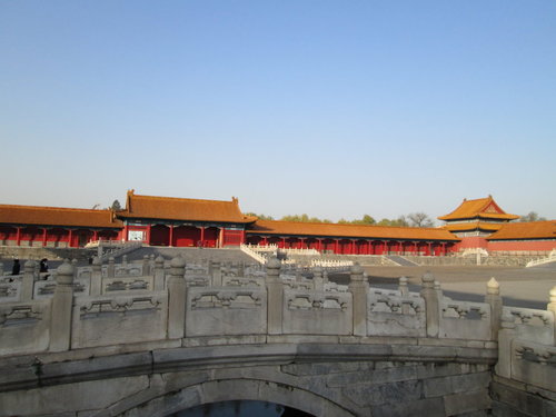 進了天安門的城門後,我們從南門進入也就是大家常聽說的午門,電視劇都說推出去午門斬首示眾其實是錯誤的 午門:中門為皇帝出入專用,但在清代,新科狀元、榜眼、探花在發榜之日可以從該門進出一次 此外,皇帝結婚時,皇后可以乘轎從中門進入,其他文武官員從左門進出,宗室王公從右門進出 清代時,午門還是皇帝每年冬至頒發下一年曆書之處 遇有戰爭獲勝,也在此處舉行凱旋、「獻俘」的儀式,沙拉背後這個門就是傳說中的午門
