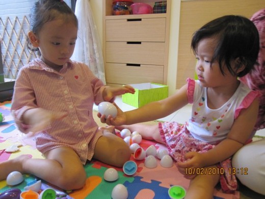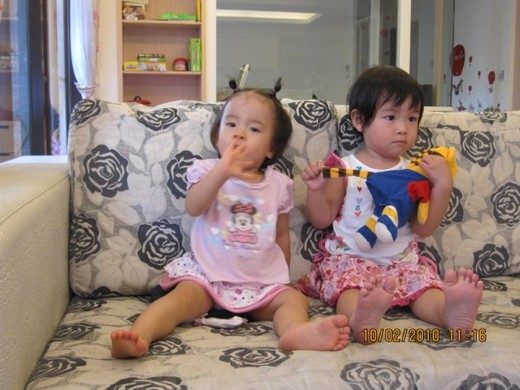 媛媛,安安,雯婷在客廳玩玩具夥在一起,等明年宜臻長大會走路加入玩伴,四個表姐妹一起玩樂:那可就熱鬧啦!