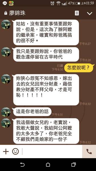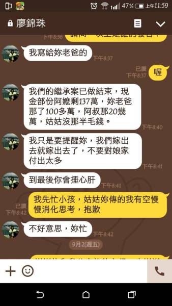 7/15傍晚我傳訊給阿弟:今天他找炳傑轉達《她說 現金部分1/2=>你跟叔叔 ※8/8日晚上與阿妹在電話中談妥:「現金、農地都三人平分,老厝22坪以公告地價8萬計算,由阿弟補償我60萬結案」,並約定8/18日辦理繼承事宜。 ※8/18日 忙完農曆七月中元法會,今天與弟妹約定要辦理阿母遺產繼承事宜,9點到市農會辦理阿母帳戶存款31萬多,再到博愛路代書處辦理內埔農地分割事宜,然後又趕到高雄台銀辦理阿母帳戶存款90多萬,所有遺產我、阿弟、阿妹三人均分,另外老厝由阿弟補貼我公告地價的1/3〈60萬〉,全部遺產繼承辦理完畢,也算是在明天阿母百日忌前的圓滿。 ※8/19日〈農曆7/17〉,今天是阿母往生做百日忌辰,早上阿真準備了拜拜的飯菜,9:20我點香請阿母來吃好料,也向阿母秉告昨天遺產兄弟妹已三人平分辦理完畢,請阿母放下安心然後卜杯-允杯歡喜! 稍後阿弟夫妻和小兒子上樓也點香向阿母致意匆忙離去,我下樓見到阿妹信基督在屋外沒入門面臭臭,送走他們我回來讀唱-彌陀經普佛儀軌,自己感覺蠻莊嚴的-百日佛事。 本想今天阿母做百日忌,遺產繼承也圓滿辦好了,所有一切的不愉快事從此化消,不料晚上這個錦珠妹妹又開始失心喪狂的傳來惡毒的line如下: 17:47 廖錦珠 自己要問自己的良心,事情做了,社會有一個公理存在,從你的臉孔,我看到的是一幅猙獰的面孔,那像是拜佛的人。阿母,如果去了上帝那邊,上帝會告訴她饒恕妳。如果,媽沒去上帝那裡,她如果知道你這麼沒良心,她會修理你的。 20:05 廖錦珠 我是不願意進到你不仁不義的家內,你才可恥,嫁出去的女兒對廖家沒付出比你少,當大哥沒有大哥的風範,猙獰的臉,才是可恥。