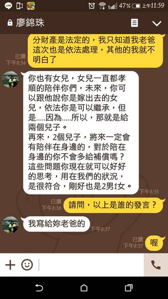 ※回完這通LINE後,我即封鎖廖錦珠這個喪心失狂妹妹的line,打算從此與牠斷絕往來!※ 8/20日,原本我還想財產繼承辦完阿母百日忌後能低調放下所有之前的怨,與阿弟阿妹展開新的和諧往來親情因緣,但是這個妹妹在阿母百日忌拜時不來靈前,當我下樓碰面時惡眼相視,更在當晚又失瘋傳訊惡言相待,我決定斷絕與牠兄妹之情! 早在阿真這個大嫂嫁入廖家為媳,牠才是個高中生就對大嫂惡意相待,我是養子,牠也是養女卻是三姨的次女,只有阿弟是阿母懷胎所親生,當年阿弟還是國小生,本來廖家錢財農豬事我夫妻都幫忙做,自從阿弟成年結婚後阿母開始變心,我夫妻只有做的份,錢財的事根本都是阿母掌管;甚至阿母昧著良心搧惑阿爸產生對我夫妻偏見。阿爸往生後所有財產由阿母繼承,我這養子長子開始被廖家歸類為-外人。 從此財產阿妹主導老厝也變更給阿弟、雲林農地也賣說給阿母生活要用,還好內埔6分田地牽涉阿母領農保年金沒被賣,所以這次遺產繼承我才得分到1/3,看到權狀是我的名字-我很感恩,這是我夫妻在阿爸往生前20年的辛勞付出所應得,也是法律保障的繼承權益。 阿母往生所有後事我夫妻都甘願承受歡喜來拜,也算是報答廖家族和父母養育之恩;牠沒感恩大哥大嫂,為了財產還對我和阿真惡言相待。 8/18日所有存款、農地、老厝全部1/3兄弟妹三人均分,破壞了阿妹牠的計畫-我得到我應得的份,牠很不甘心!所有惡毒絕情的作為和言語都出來;我把這段期間與牠的對話都複製紀錄下來--留待後世公評。