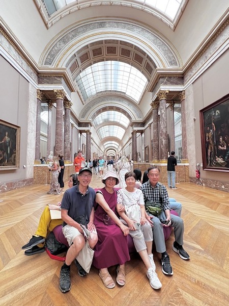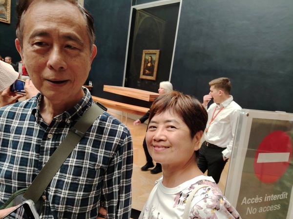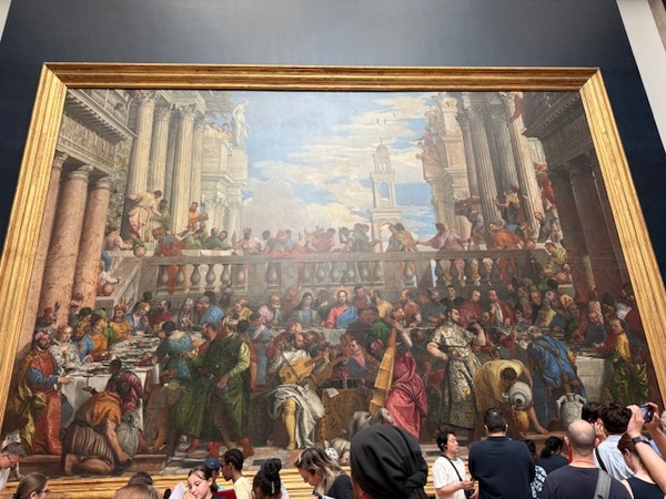 每次參觀羅浮宮,都像經歷一次盛宴,那麼多的名畫、雕塑,看也看不完,再加上現場人潮洶湧,讓人有點消化不了。今年,有專業導覽帶路,挑著欣賞,有了不同以往的經驗。 專業導覽是妹妹的同學,學的是音樂,後來轉而從事博物館導覽。 在人潮絡繹不絕的羅浮宮,這樣的參觀方式雖然蜻蜓點水,卻蠻有效率,讓我對幾幅名畫留下深刻印象。 第一幅是我十多年前第一次參觀羅浮宮很喜歡的「大宮女」,一個土耳其內宮的裸體宮女,豐腴動人,回眸的姿態尤其嫵媚。我買了一張圖卡,擱在臥室。這回再見,知道這幅畫作更多點滴,備感親切。 最驚奇的是「迦納的婚禮」,這幅畫作是羅浮宮館內最大的一幅,為文藝復興晚期威尼斯畫派保羅委羅內塞的作品,描繪約翰福音記載的一段聖經故事,耶穌、聖母瑪利亞與門徒參加一場在迦納舉辦的婚禮,席中酒喝盡了,耶穌命門徒將石缸盛滿水,待盛杯試飲時水已化為美酒。 整場婚禮有130人,耶穌與瑪利亞端坐中央,新郎、新娘擠在邊邊,最醒目的前排中央是以畫家及其老師提香等為藍圖的提琴樂手,畫家本人除了化身中提琴樂手,試飲酒的男子也是,兩位白衣男一坐一站,都占最佳位子,同樣面容清晰,風流倜儻,一眼就抓住觀賞者的目光。 「白兔旁的聖母」則是原作提香與臨摹馬奈的作品上下一起陳列,十分有趣。 羅浮宮最熱門的還是「蒙娜麗莎的微笑」,小小一幅畫前擠滿了人,保安更甚以往,這回也是來去匆匆,一瞥即過。 這趟羅浮宮行,最後以「羅浮宮時裝展:藝術與時尚」作結,這是羅浮宮第一次時裝展,以高級訂製服為題,探討時尚與藝術間跨時空的共鳴。老實說,除了Balenciaga在2023年高級訂製服系列中,設計師Demna以聖女貞德發想的盔甲禮服,與1560年法王亨利二世的盔甲並展外,其他並不覺得有太多共鳴感。