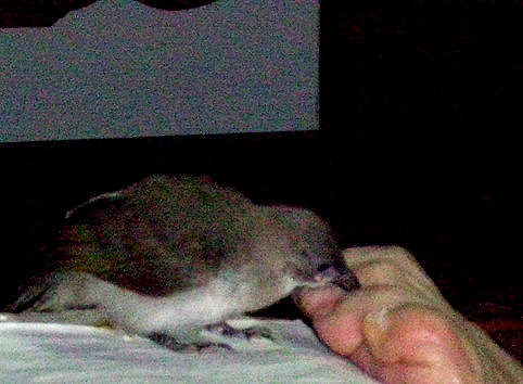 阿嬤用手指逗著, 讓我啄著玩