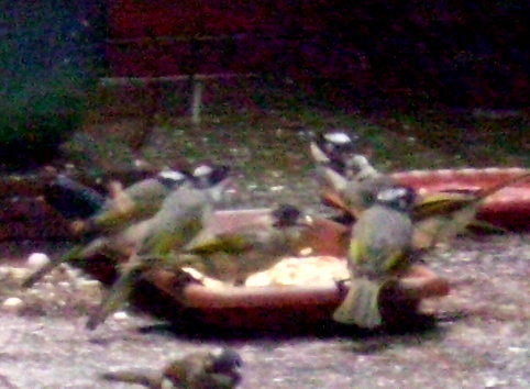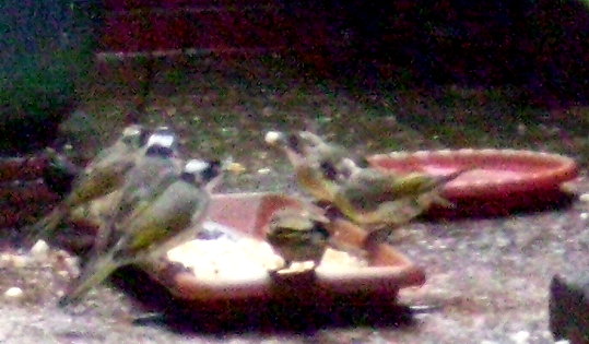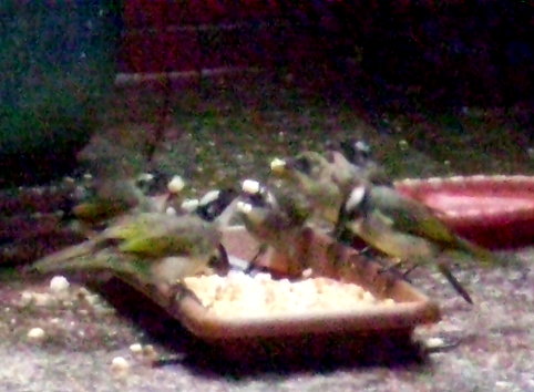 大小白頭翁搶食牠們最愛的吐司麵包 ( 我平常會將胚牙吐司或全麥吐司切成小粒小粒,以方便牠們啄食