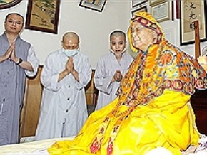 海明寺觀音老人,悟明長老圓寂後,穿上法衣的照片 觀音老人開示:「四大所成幻化身,放下一切悟本真,