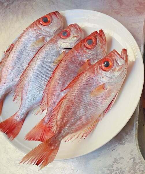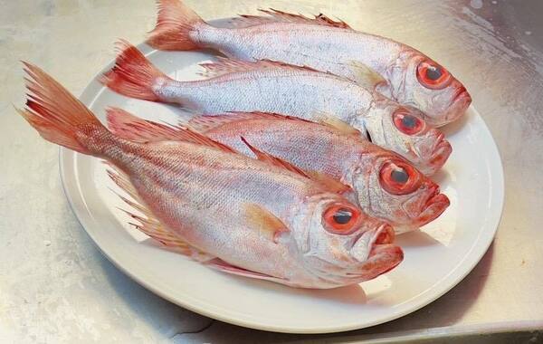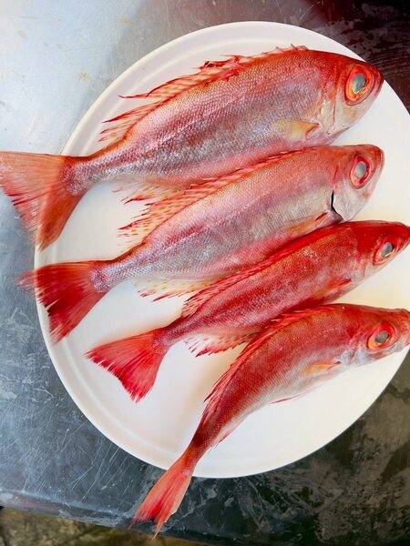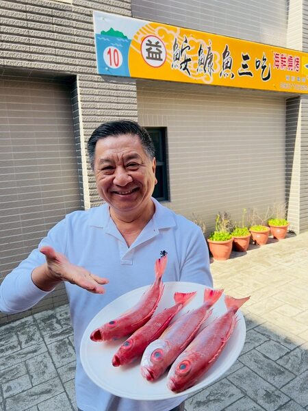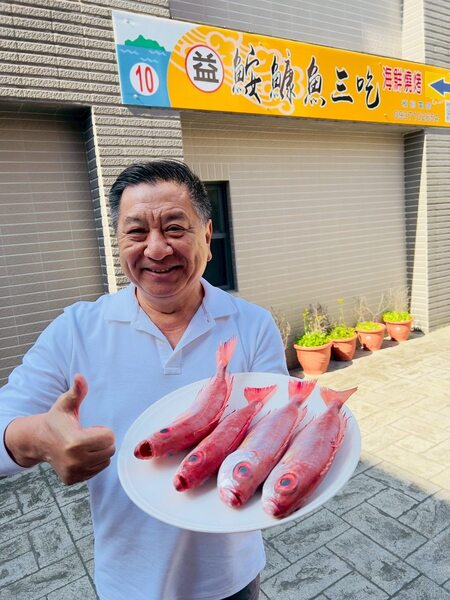 宜蘭頭城大溪漁港「鮟鱇魚三吃」阿益老板張羅現撈野生肥美紅目鰱,觀之即教人食指大動,建議燒烤。