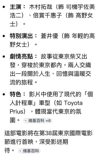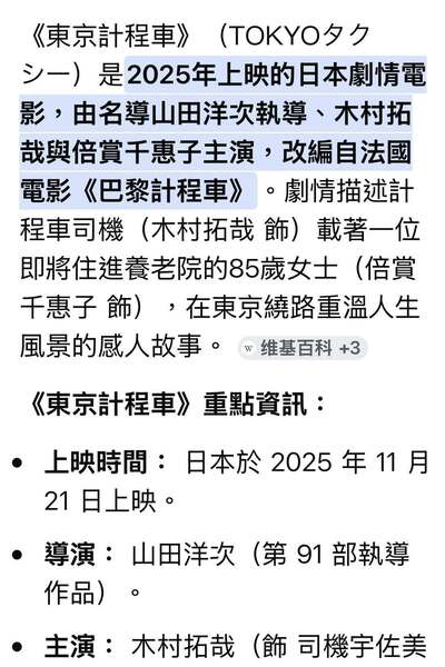 《東京計程車》(TOKYOタクシー)是2025年上映的日本劇情電影,由名導山田洋次執導、木村拓哉與倍賞千惠子主演,改編自法國電影《巴黎計程車》。劇情描述計程車司機(木村拓哉 飾)載著一位即將住進養老院的85歲女士(倍賞千惠子 飾),在東京繞路重溫人生風景的感人故事。