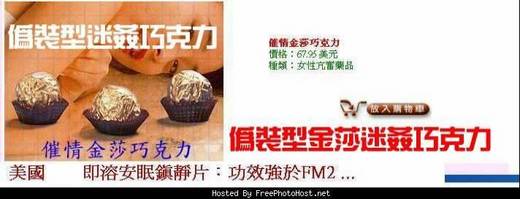 在外喝飲料,杯子不要離開視線,已免被下迷葯。也不要買酒保已經調好的飲料,一 輩子碰上一次就遺憾終生。但是FM2也可能化身為令許多人心動的金莎巧克力…… 截至警方破案並告知被害人為止,被歹徒『性侵害』的被害少女,還不知道自己已經被性侵害了。 偽裝型迷姦食品飲料最最可怕的藥效如下: (1)無異味或苦澀味,15 分鐘內產生頭昏、全身發軟並昏迷的藥效反應。 (2)發生藥效後,自你昏迷開始再往前 2-4 小時的記憶 都會清除掉。 (3)藥效過程中,中斷大腦記憶,被害人不會有任何一絲一毫的印象。 PS:換句話說,你醒來後,完全不記得 2-4小時以前和以後的事情, 偽裝型迷姦食品飲料的外觀: 請您自己隨時提高警覺並小心,並注意您的生活有沒有任何『空白時間』, 萬一如果有『空白時間』,那強烈建議您在第一時間到醫院驗傷;作緊急處理希望大家要當心! 希望大家轉寄給女性友人, (這是友人轉寄的郵件,與其轉寄來轉寄去,不如直接貼在這裡。祝大家平安!) |