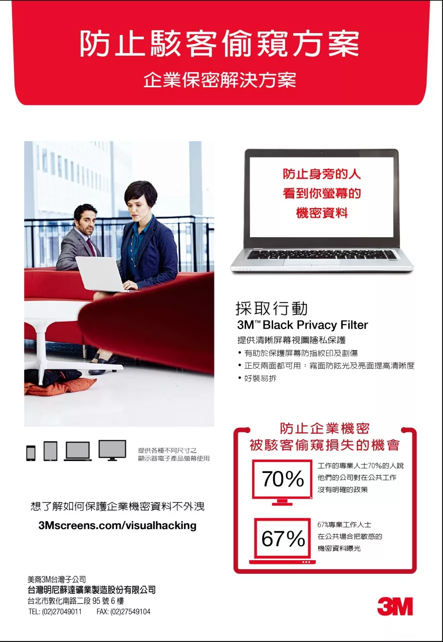 3M 螢幕防窺保護膜 易於貼合與卸除,利用 3M 超微細百葉窗光學技術,讓你可在公共場所使用 您的裝置 Ipad,卻又不會洩漏任何機密資訊。你能清楚地看見手機上的各種資訊,而在你身旁的人們則只能看見陰暗的螢幕畫面。