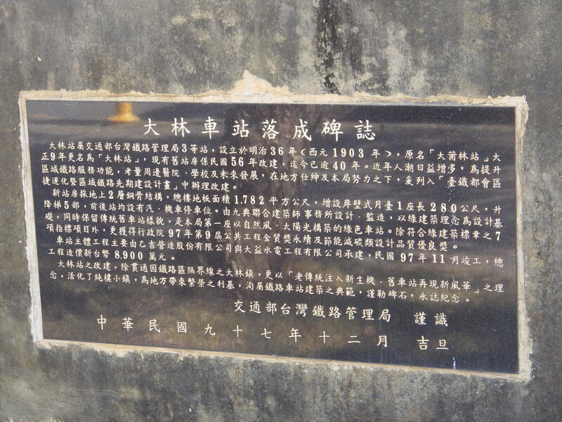 文、圖:老漁翁 【老漁翁徒步Round台Ⅱ】2025.02.11一早從斗南車站往南推進,第一站走到石龜車站,第二站走進國進慢城的嘉義大林,再到大林車站。 大林車站位於臺灣嘉義縣大林鎮,為臺灣鐵路公司縱貫線及大林糖廠小梅線(廢止)的鐵路車站,是臺鐵第一座綠建築車站。 歷史 1903年12月15日:設站[3],站名「大莆林」(日語:大莆林/たいほりん Taihorin )。 1920年:站名更名為「大林」(日語:大林/たいりん Tairin )。 2004年2月17日:首度有自強號列車停靠。 2007年4月2日:配合臺鐵捷運化增建月台及跨站式站房動工。 2008年12月5日:新月台及跨站式站房啟用。 2013年9月30日:啟用多卡通刷卡機。 車站概要 本站為三等站。站內設有「鐵路之旅 - 小站巡禮紀念章」之戳章,為「鐵道旅行·幸福美好111」集章活動之第40座車站。新站房為臺鐵首座以綠建築概念所設計的車站。車站附近設有公車站牌可轉乘12條市區公車。 車站構造 本站設有島式月台一座、岸式月台兩座,無障礙電梯5座。配合臺鐵捷運化下「臺鐵都會區捷運化暨區域鐵路先期建設計畫」案改建為跨站式站房。 利用狀況 根據2023年資料,本站每日旅運量約為2,975,在台鐵各站中排行第72名。 (以上摘自大林車站維基百科) ↓這是2025.02.11造訪的大林車站 |