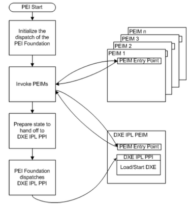 下圖說明了PEI Phase的操作流程,當進入PEI之後,首先會 初始化PEIM的dispatcher,接著執行各個PEIM直到最後一個PEIM存在DXE IPL將control及HOBs 轉移給DXE Phase。