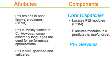 PEI core locate、validates和dispatch 執行PEI modules(PEIM),這些module是用來初始化platform的feature或chipset。