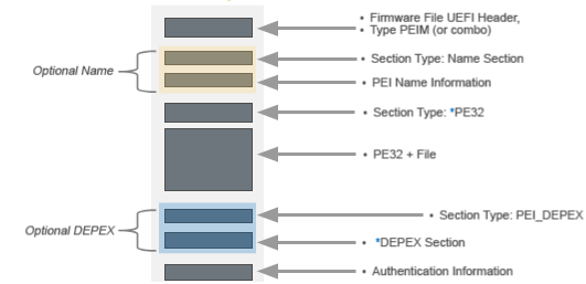 PEIM binary image 可以從存放的FV執行或是在永久記憶體被初始化後shadow過去的compressed component中執行。 PEIM可執行的section可能是position-dependent 或 position-independent code. 如果是position-dependent code, relocation information must be provided in the PEIM image to allow FV store software to relocate the image to a different location than it is compiled. 下圖是PEIM的layout,有些是必要的有些則是optional的。