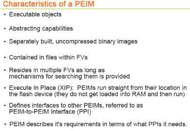 PEI是在rom裡面執行的,因此有非常的小的start-up code。Modular的driver都是absolutly address的。