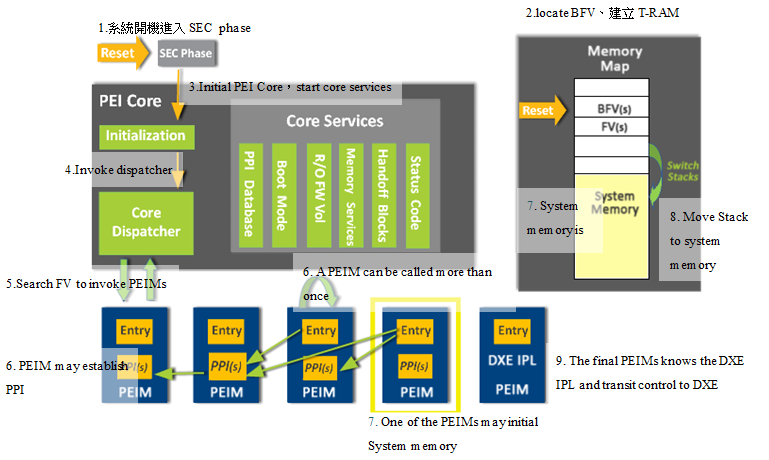 Pre-EFI Initialization (PEI) 是Platform Initialization的第二個Phase定義在Platform Initialization Specification, Ver 1.2.1, Volume 1。