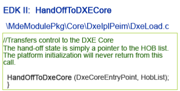 - DXE IPL將 control傳給DXE core。當傳遞完成後,所有的PEI phase的services及PPI將無法再access。唯一傳遞給DXE的只有HOB list
