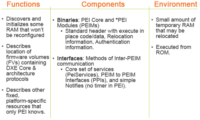- 在開發一個feature的時候,我們基本上都會希望可以使用memory以及有基本的chipset被初始化。並且,PEI也負責了S3 (resume )的部分。
