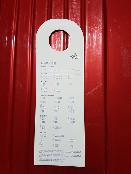 日前的costa歌詩達郵輪新浪漫號之旅,因為住的是海景陽台房,晨起,我多是捨棄前往免費餐廳用餐,改選客房服務,前一晚先勾選送餐時段及餐飲品項,直接在房內陽台用餐,欣賞難得的海上日出景色。 而當郵輪航行公海的時候,我最愛在陽光甲板上發懶放空賞景、迎風或逆風繞著甲板慢跑,亦或預約SPA、上健身房練練身子,或是坐在bar喝咖啡聽音樂,抽空逛逛免稅商店、買些伴手禮。