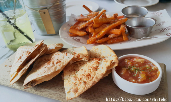 因為實在是熱的沒有食慾,加上我們的人數不多,因此捨棄了今夏餐廳新推的燒烤海鮮拼盤,還是點了這款我個人喜愛的經典款~墨西哥燻雞脆薄餅佐綠番茄莎莎醬.....
