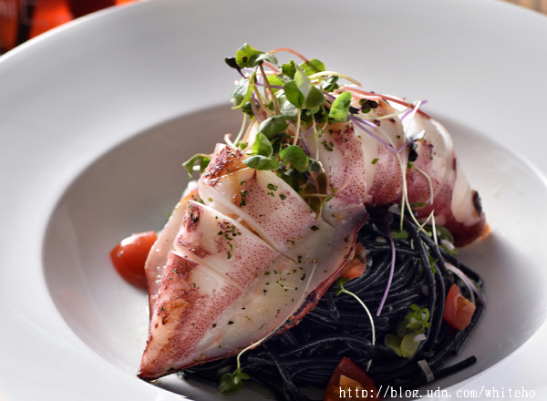 碳烤海鮮慕斯透抽墨魚麵(330元)洋溢著濃濃的夏日海味,一整尾透抽內填入海鮮慕斯混合花枝漿、干貝、蝦仁、西班牙辣腸,蒸熟後再碳烤,搭配蒜、蔥、小番茄、辣椒、