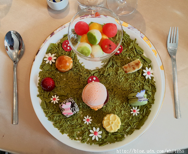花園寶島繽紛盤~黑糖糕、金鑽鳳梨酥、烏龍茶馬卡龍、牛軋糖、芝麻巧克力、桐花綠豆糕、燕巢芭樂、金鑽鳳梨、西瓜、木瓜牛奶冰淇淋